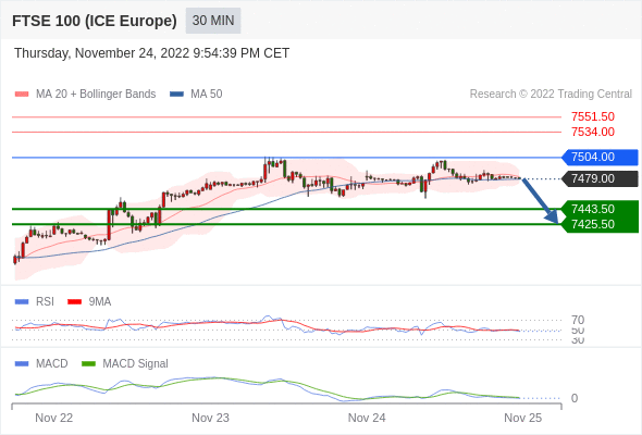 英国富时100指数期货 当日内: 当 7504.00 维持阻力位时,看跌,目标锁定在 7425.50 。