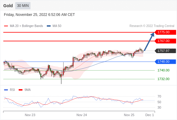 在 1748.00 之上,看涨,目标价位为 1767.00 ,然后为 1775.00 。