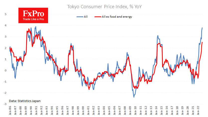 东京的总体通胀估计显示,11月份的年度物价增长率为3.8%,而一个月前为3.5%,预期为3.6%。 不包括食品和能源价格的核心指数从2.2%加速到2.5%(1992年以来的最高水平),表明全国范围内的通胀继续加速超过2%的目标。