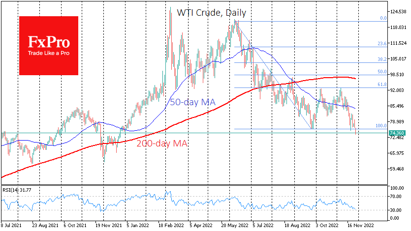 单看图表,价格可能会迅速回落10美元,至64美元,上一次获得买家支持是在2021年8月和12月。斐波那契模式的实现表明,油价将跌至49美元(最初跌幅的161.8%)。
