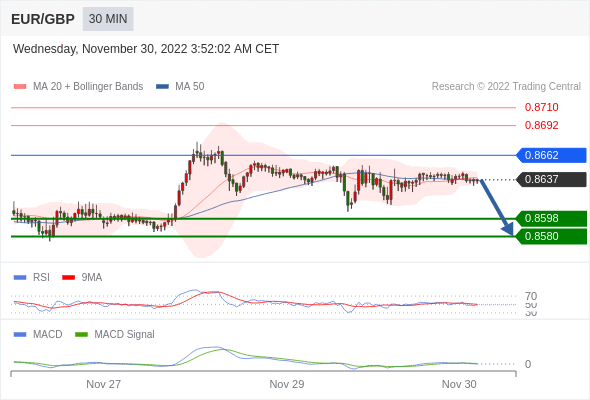 RSI技术指标低于50。 MACD技术指标呈现看多状态并 处在其信号线的下方。 另外,价位在其20天移动平均线以下 ( 0.8639 ) 但高于其50天移动平均线 ( 0.8637 )。