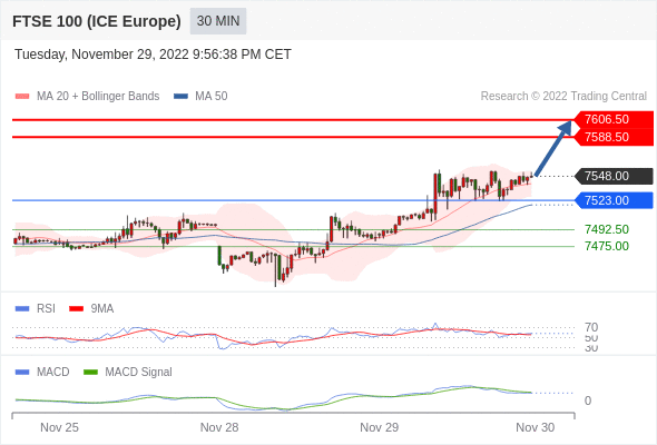 英国富时100指数期货 当日内: 看涨,当 7523.00 为支撑位,目标定在7606.50。