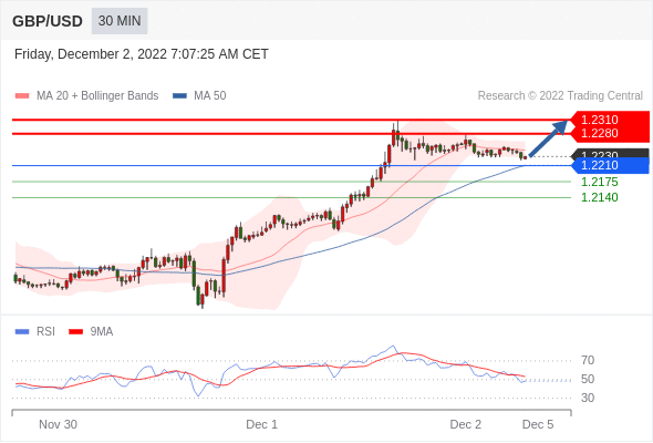 在 1.2210 之上,看涨,目标价位为 1.2280 ,然后为 1.2310 。