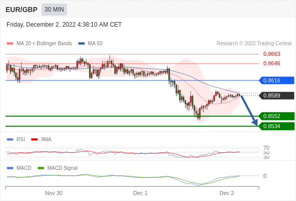 向上突破 0.8616 ,将带来继续上行的趋势,目标位定在 0.8646 和 0.8663 。
