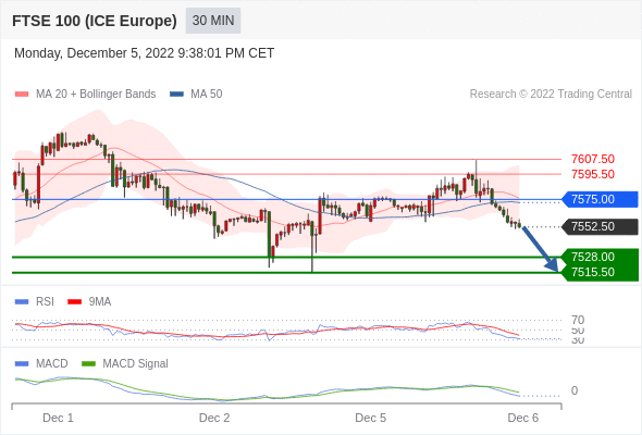 英国富时100指数期货 当日内: 看跌,在 7575.00 之下。