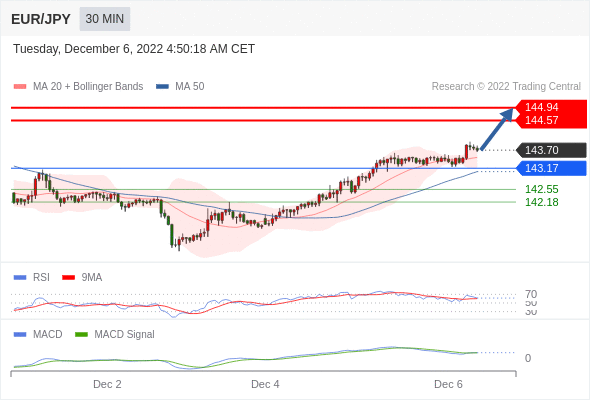 欧元/日元 当日内: 看涨,当 143.17 为支撑位。