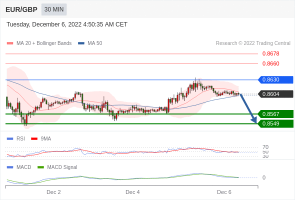 欧元/英镑 当日内: 当 0.8630 维持阻力位时,看跌,目标锁定在 0.8549 。