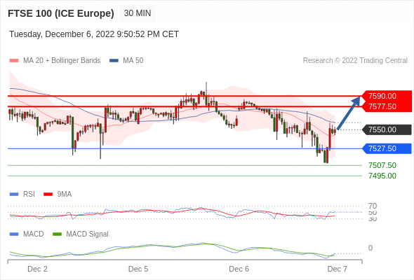 如跌破 7527.50 ,英国富时100指数期货 目标方向定在 7507.50 和 7495 。