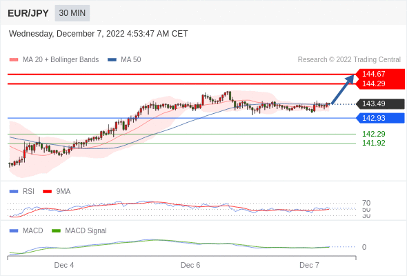欧元/日元 当日内: 看涨,当 142.93 为支撑位。