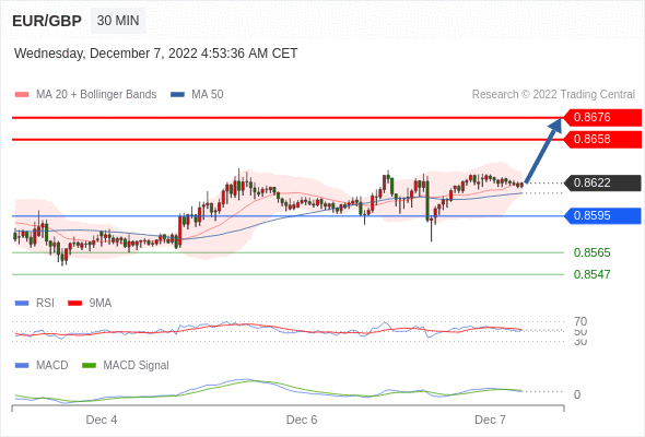 欧元/英镑 当日内: 看涨,当 0.8595 为支撑位,目标定在0.8676。