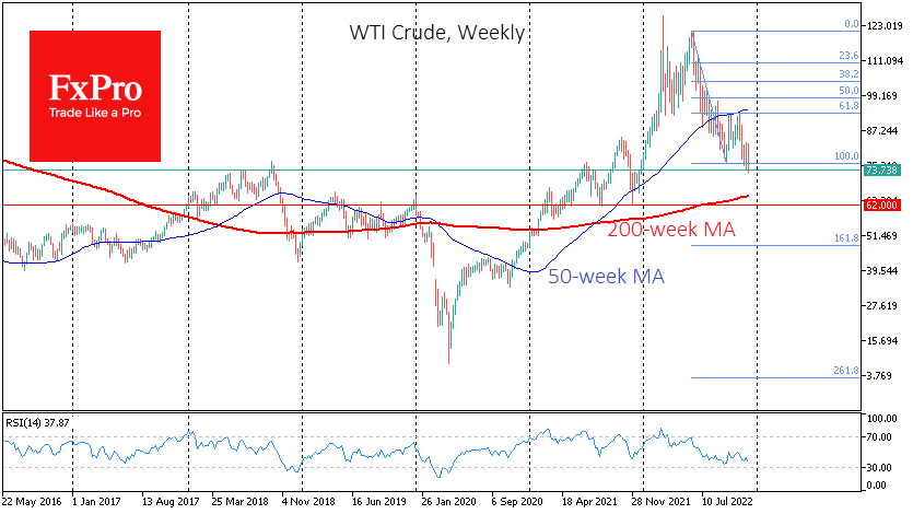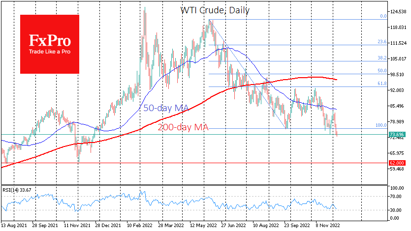 从价格动态的纯技术角度来看,下跌远未结束。油价在11月底改写了9月份的低点,并在今天再次更新了它们。这似乎是继9月底纠正回调至6月至9月首回合下跌的61.8%后的第二次下行势头。这种模式的下行目标水平为实际走势的161.8%。在我们的情况下,这接近每桶50美元。