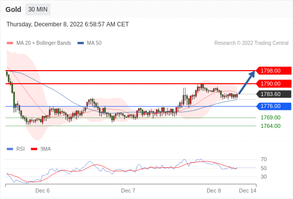 在 1776.00 之上,看涨,目标价位为 1790.00 ,然后为 1798.00 。