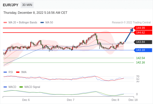 欧元/日元 当日内: 看涨,当 143.18 为支撑位。