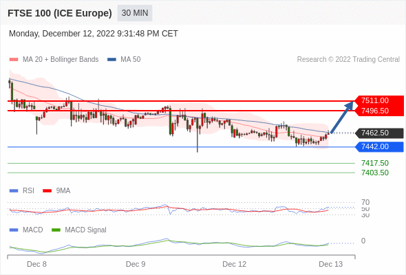 RSI技术指标大于中性区域50。 MACD技术指标处在其信号线之上 看空。 另外,价位低于其50个时期移动平均线 ( 7463.80 ) 但高于其20个时期移动平均线 ( 7456.65 )。