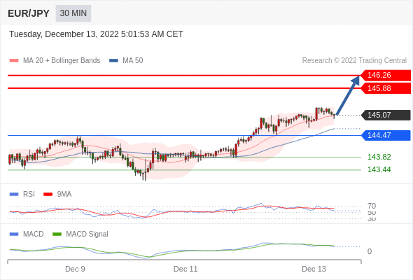 欧元/日元 当日内: 看涨,当 144.47 为支撑位,目标定在146.26。