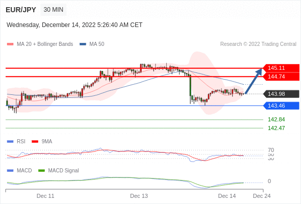 欧元/日元 当日内: 有上涨的可能,目标价位定在 145.11 。