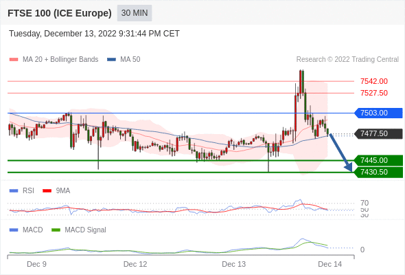 英国富时100指数期货 当日内: 逐渐下跌,当 7503.00 阻碍上行,则 7430.50 为目标位。