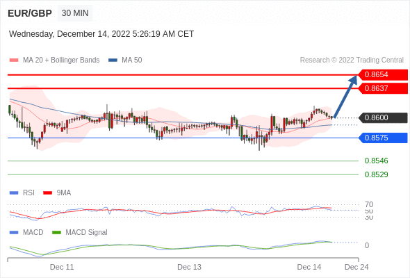 欧元/英镑 当日内: 看涨,当 0.8575 为支撑位,目标定在0.8654。