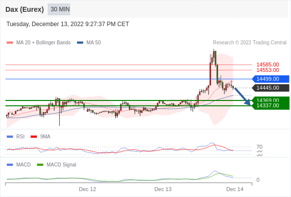 德国DAX指数期货 (Eurex)? 当日内: 逐渐下跌,当 14499.00 阻碍上行,则 14337.00 为目标位。