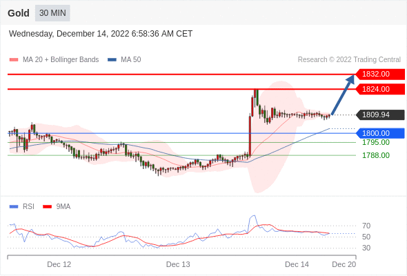 在 1800.00 之上,看涨,目标价位为 1824.00 ,然后为 1832.00 。