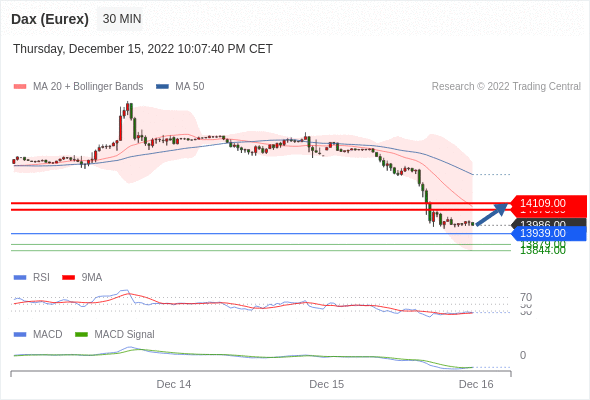 RSI技术指标小于30。在这种情况下,说明有很强的下跌趋势,或者意味着处在超卖的状态下,可能会有向上的反弹。我们将观察RSI技术指标是否出现背离现象。 MACD技术指标处在其信号线之上 看空。 此外,价位低于其20个时期及50个时期移动平均线 ( 分别位于 14089.95 和 14270 )。