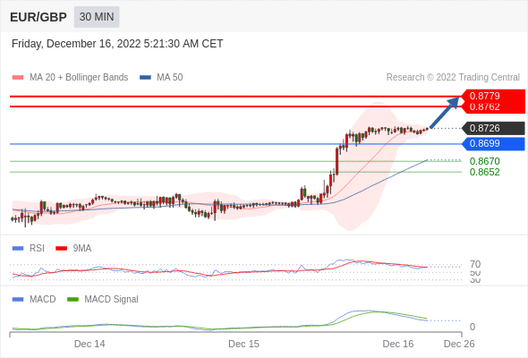 欧元/英镑 当日内: 看涨,当 0.8699 为支撑位,目标定在0.8779。