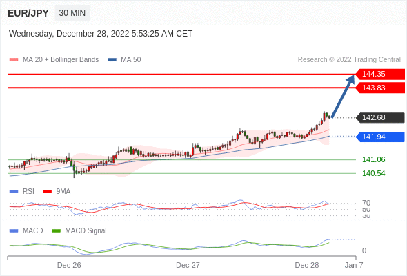 欧元/日元 当日内: 看涨,当 141.94 为支撑位。