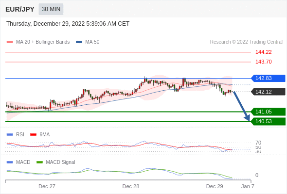 欧元/日元 当日内: 看跌,在 142.83 之下。