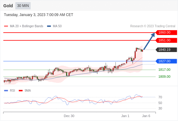 在 1827.00 之上,看涨,目标价位为 1851.00 ,然后为 1860.00 。
