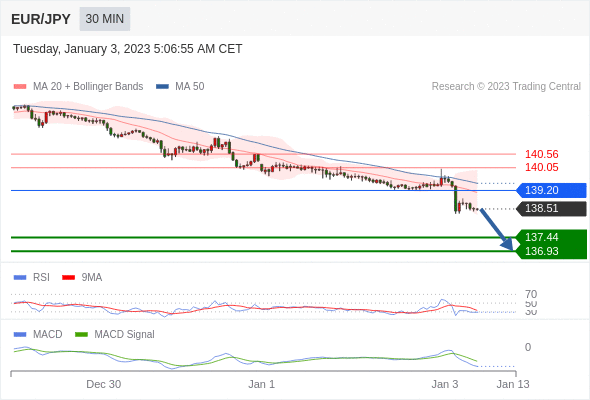 欧元/日元 当日内: 看跌,在 139.20 之下。