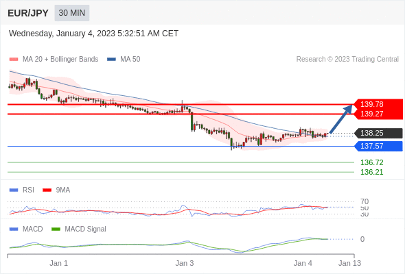 欧元/日元 当日内: 看涨,当 137.57 为支撑位,目标定在139.78。