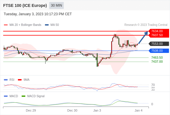 RSI技术指标大于中性区域50。 MACD技术指标呈现看多状态并 处在其信号线的下方。 此外,价位高于其20个时期及50个时期移动平均线 ( 分别位于 7546.73 和 7512.23 )。