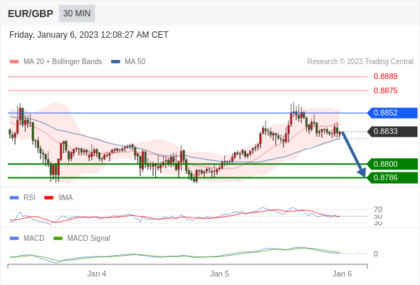 欧元/英镑 当日内: 逐渐下跌,当 0.8852 阻碍上行,则 0.8786 为目标位。