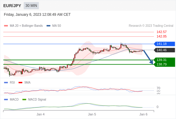 欧元/日元 当日内: 逐渐下行,当 141.18 为阻力位时,目标位定在 138.79 。