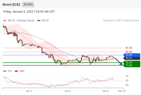 布伦特原油 (ICE)? (H3)? 当日内: 短期关键阻力位在79.90。