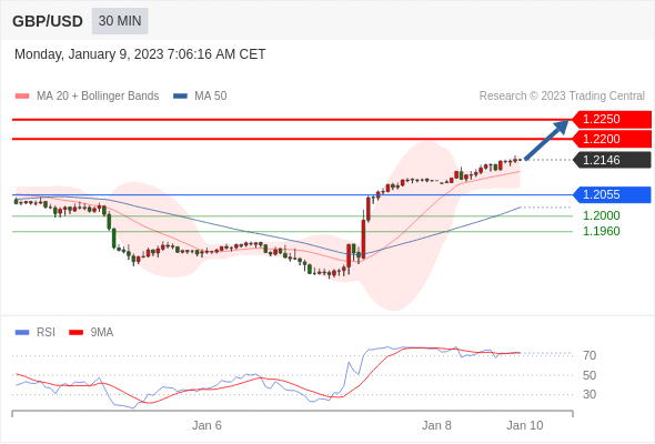 在 1.2055 之上,看涨,目标价位为 1.2200 ,然后为 1.2250 。