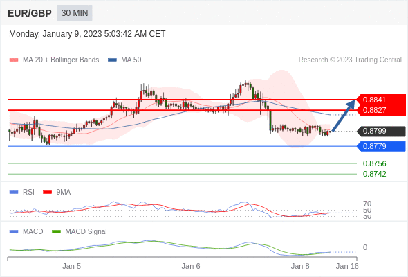 欧元/英镑 当日内: 有上涨的可能,目标价位定在 0.8841 。