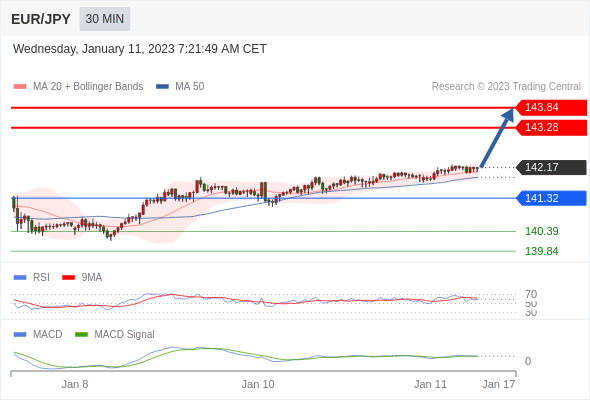 欧元/日元 当日内: 看涨,当 141.32 为支撑位,目标定在143.84。
