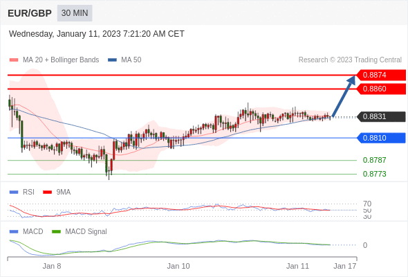 欧元/英镑 当日内: 看涨,当 0.8810 为支撑位,目标定在0.8874。