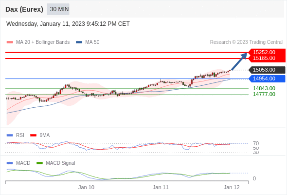如跌破 14954 ,德国DAX指数期货 (Eurex) 目标方向定在 14843 和 14777 。