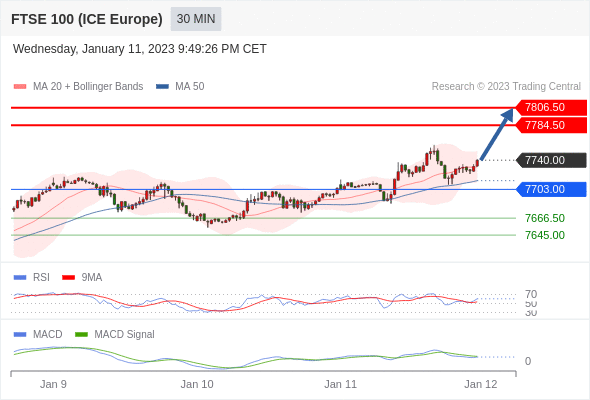 英国富时100指数期货 当日内: 看涨,当 7703.00 为支撑位,目标定在7806.50。
