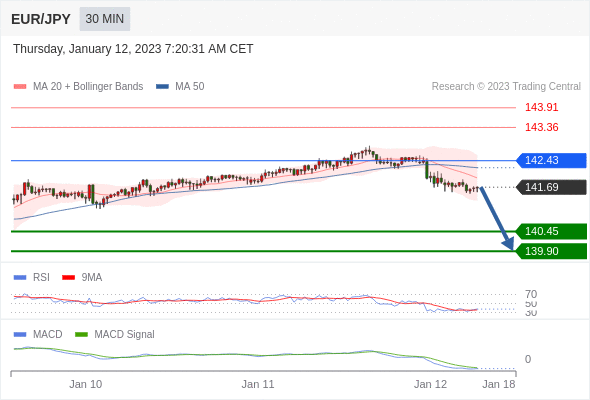 欧元/日元 当日内: 看跌,在 142.43 之下。
