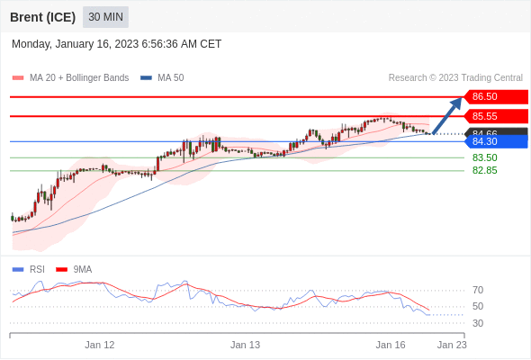 布伦特原油 (ICE)? (H3)? 当日内: 在84.30之上,看涨。