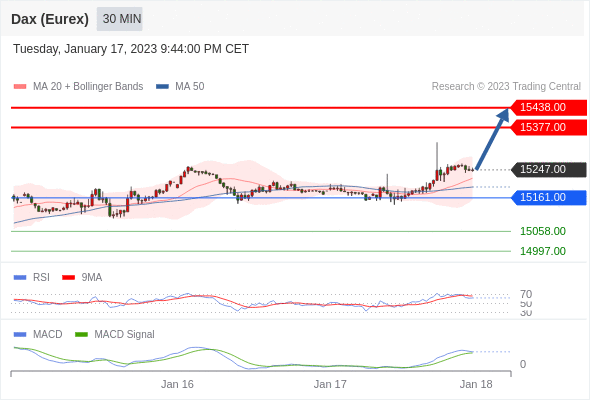 如跌破 15161 ,德国DAX指数期货 (Eurex) 目标方向定在 15058 和 14997 。