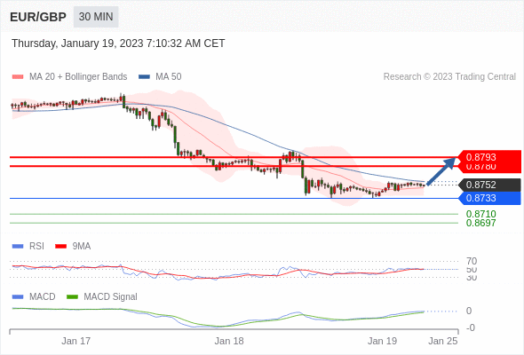 RSI技术指标超过50。 MACD技术指标处在其信号线之上 看空。 另外,价位低于其50天移动平均线 ( 0.8757 ) 但高于其20天移动平均线 ( 0.8749 )。
