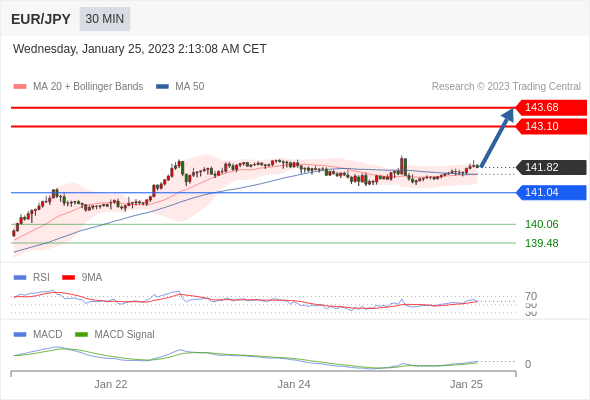 欧元/日元 当日内: 看涨,当 141.04 为支撑位。