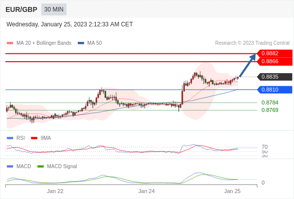欧元/英镑 当日内: 看涨,当 0.8810 为支撑位,目标定在0.8882。
