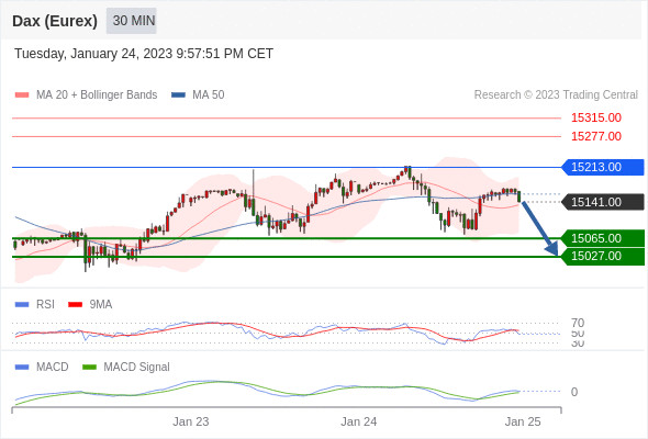 德国DAX指数期货 (Eurex)? 当日内: 当 15213.00 维持阻力位时,存在回归 15027.00 的风险。