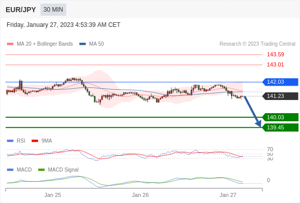 欧元/日元 当日内: 看跌,在 142.03 之下。