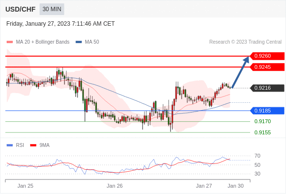 在 0.9185 之上,看涨,目标价位为 0.9245 ,然后为 0.9260 。